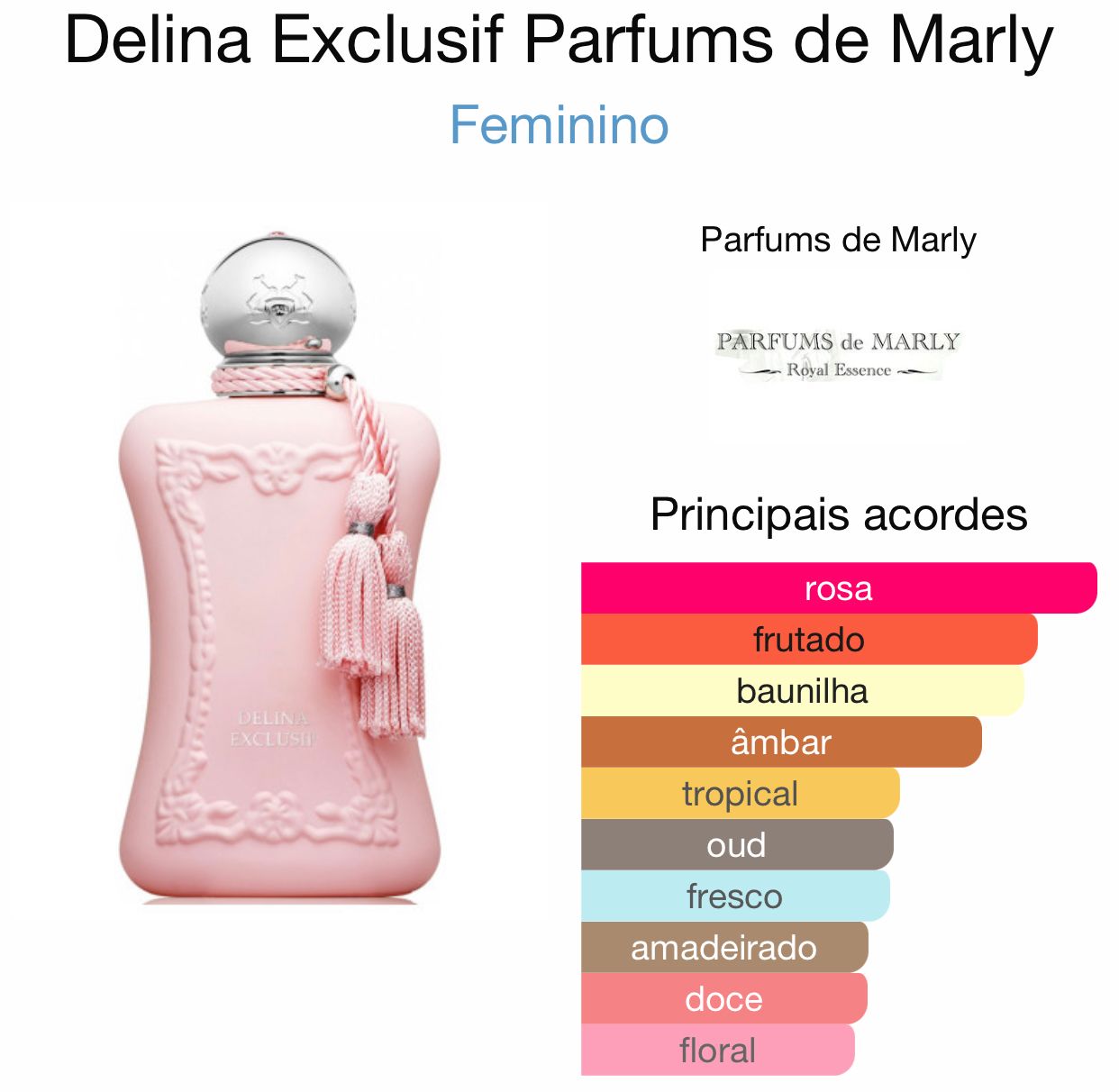 Delina Exclusif de Parfums de Marly é um perfume Âmbar Feminino. Delina Exclusif foi lançado em 2018. O perfumista que assina esta fragrância é Quentin Bisch As notas de topo são Lichia, Pera e Bergamota as notas de coração são Rosa Turca, Agarwood (Oud) e Incenso as notas de fundo são Baunilha, Âmbar e Notas Amadeiradas.