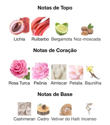 As notas de topo são Lichia, Ruibarbo, Bergamota e Noz-moscada as notas de coração são Rosa Turca, Peônia, Almíscar, Petalia
